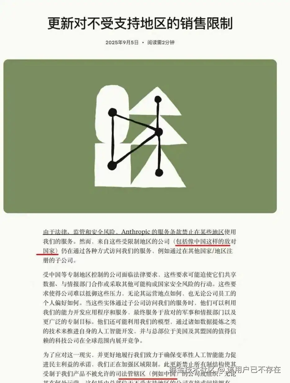 9月份 Anthropic 封禁中国用户使用 Claude,直接在官网把中国成为敌对国家(adversarial nations),态度极其恶劣。很多中国用户都被恶心到了,花钱还要被歧视?