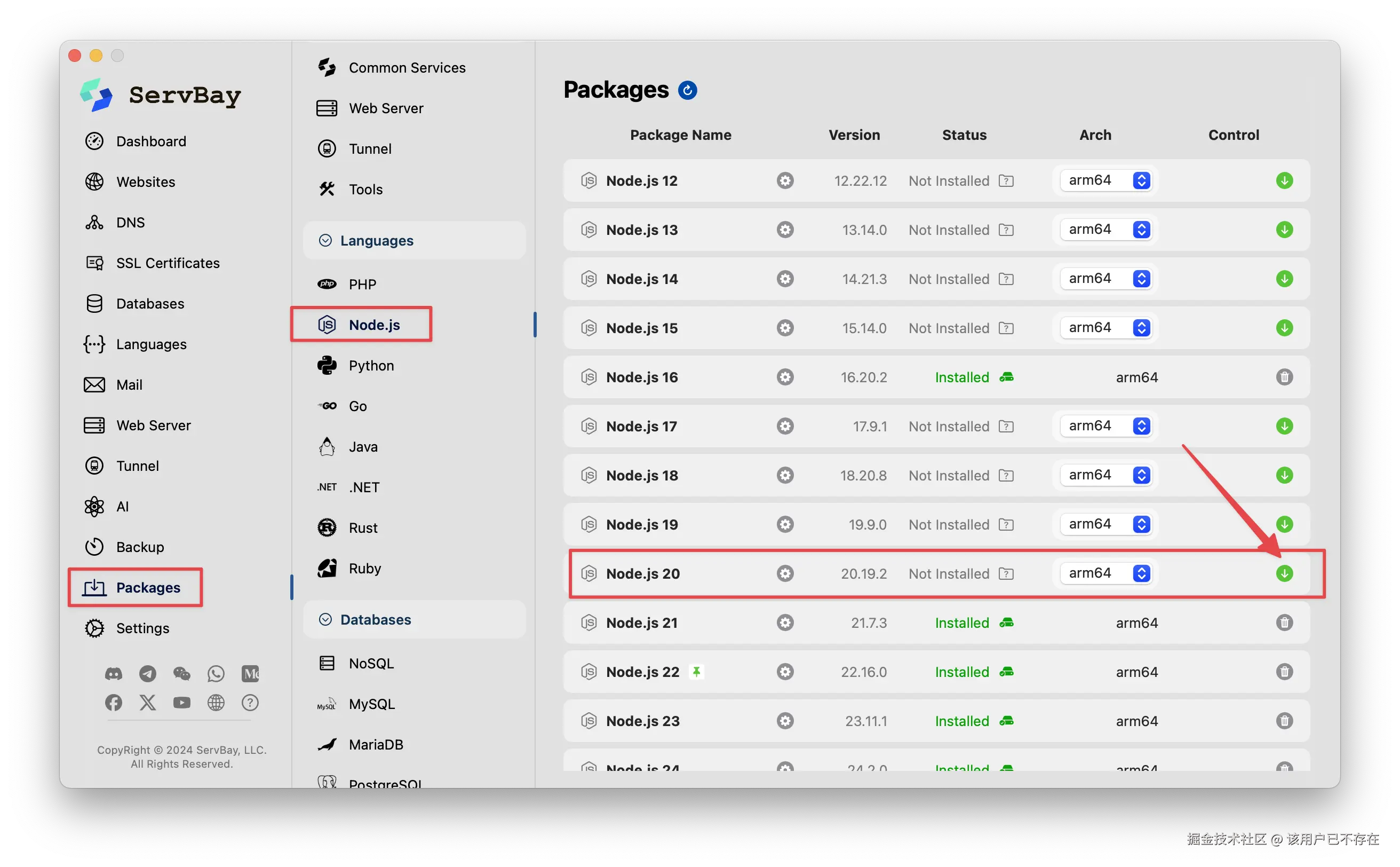 左边的菜单中选择「软件包」,选择 Node.js ,点击需要的版本安装即可。全程1分钟搞定。