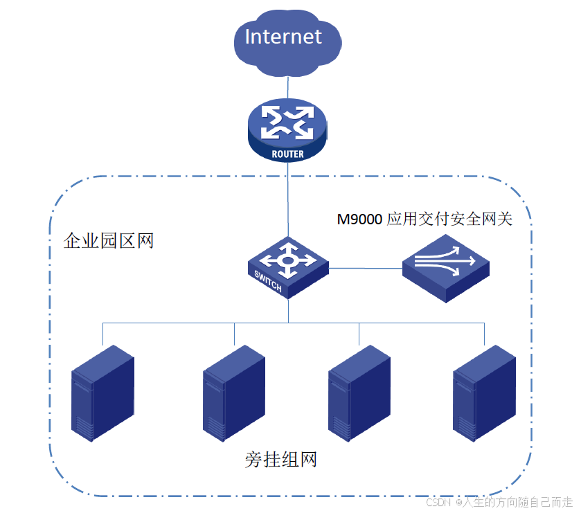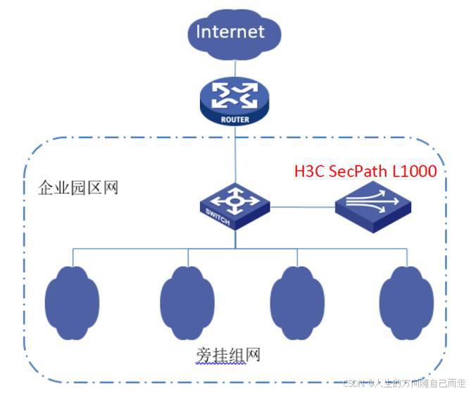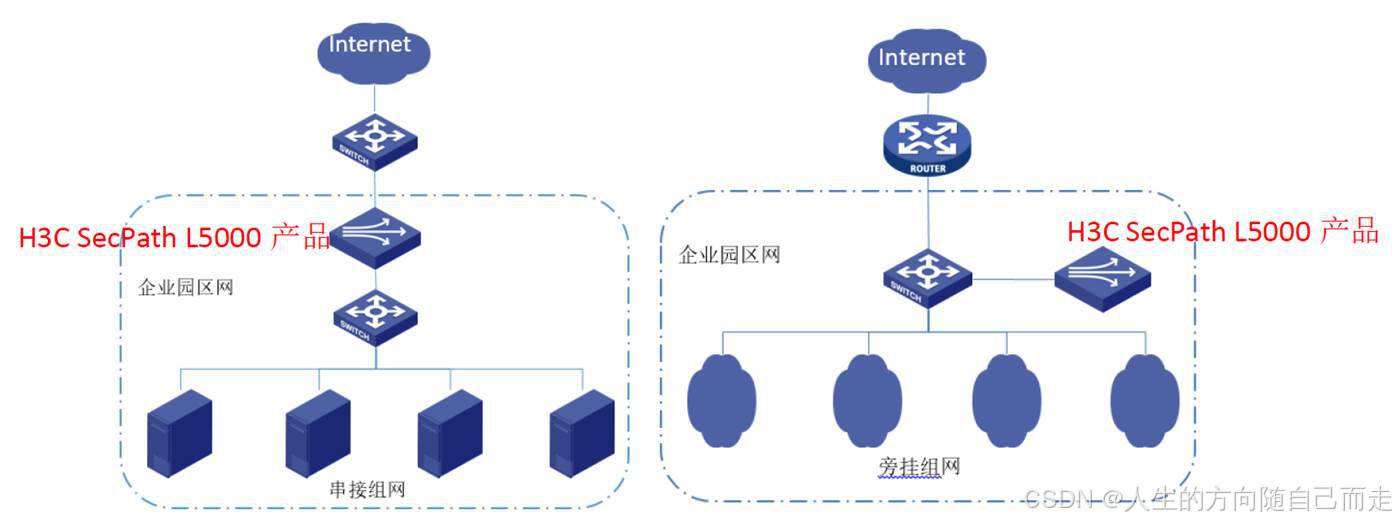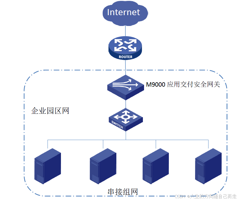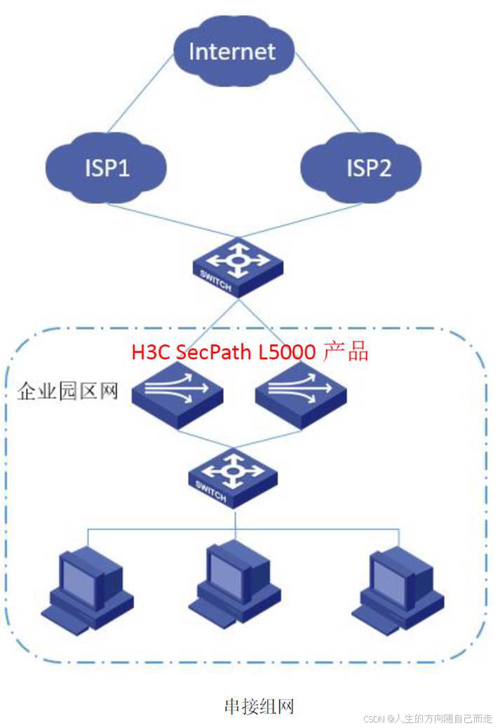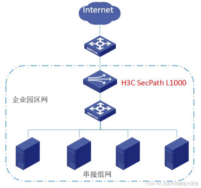 串联部署场景下由于在网络中增加了物理设备,使得网络中的故障风险点进一步增加,建议采用串联部署时考虑使用双机主主热备方式降低网络故障风险。