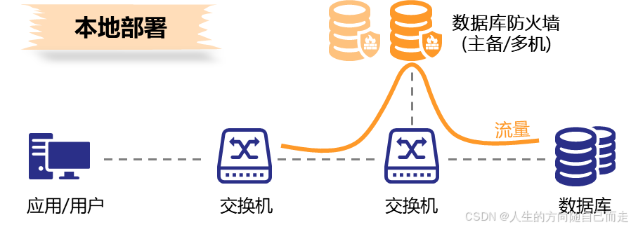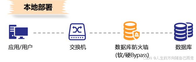 通过"物理旁路、逻辑串行"的方式部署。网络上并联接入防火墙设备,客户端连接防火墙的设备地址,并将通讯包发送至防火墙设备,再经过内部策略分析后完成客户端与数据库的交互过程。