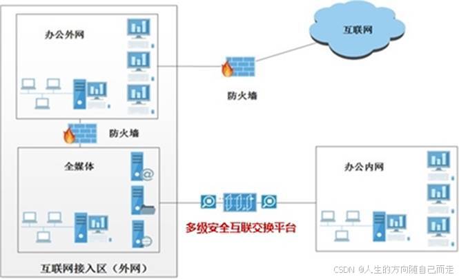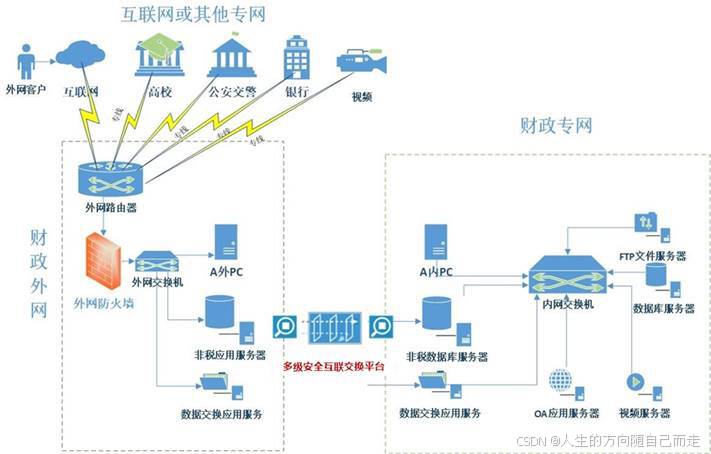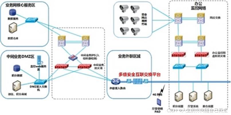 银行业来说主要业务为生产网与办公网、第三方单位、互联网之间数据交换,其中业务会涉及积分应用系统、厅堂营销系统、监控查阅系统、OA、积分商城、短信验证、企业征信、税务、智慧菜场等。通常在生产与办公之间部署多级安全互联交互平台,视业务情况分别在生产与互联网或生产与第三方单位之间亦可部署多级安全互联平台,从而实现三网之间安全隔离的数据交换。
