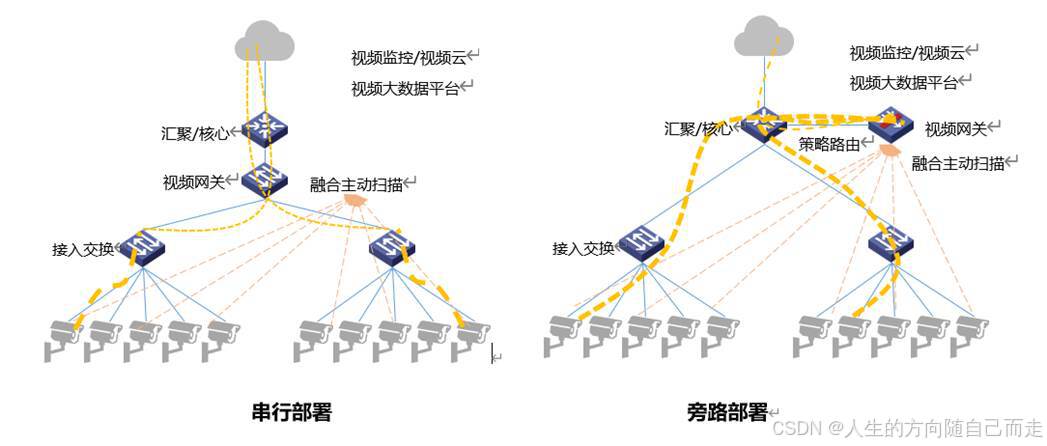 如下图所示,视频网关可以根据网络规模,布署要求等,布署在接入层、汇聚层、或者核心层。
