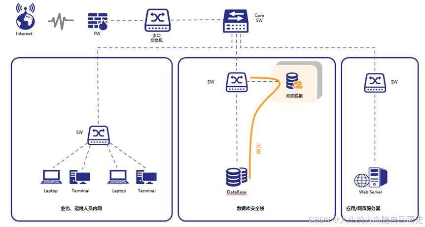 DM2000系列动态脱敏系统还可以支持旁路引流方式部署。通过在三层交换机或者路由器上配置策略路由,使访问数据库的网络流量转发到动态脱敏系统,从而实现数据库查询的实时脱敏,旁路引流方式如下所示。相比反向代理模式的优点,该模式不需要修改客户端和应用系统连接数据库的IP,且发生单点故障时,可以通过策略路由将流量切换回原数据库,保证业务正常。缺点为该组网模式更加复杂。