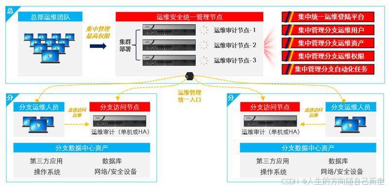 支持三台或以上的运维审计系统组建总分部署模式,通过总部的运维审计对外提供统一服务。总部运维审计可以部署为HA或集群模式,分支运维审计可以为单机或HA。总部管理节点的配置数据定期自动同步至分支访问节点中。总分部署模式可以实现总部集中管理,分支分散运维的效果。