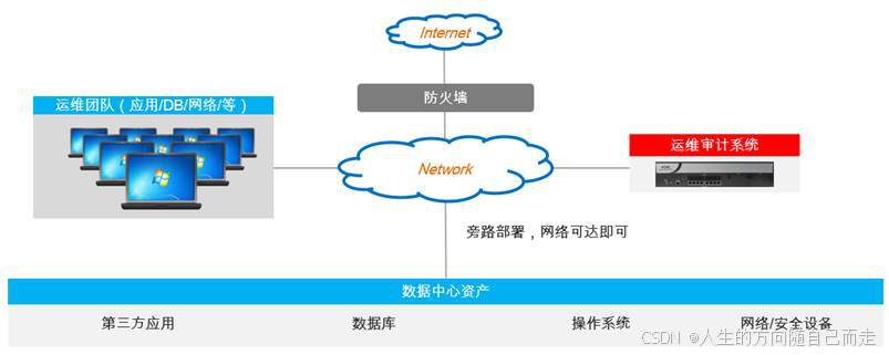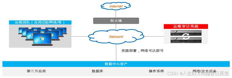 运维审计系统单机采用物理旁路、逻辑串联的部署模式,不需要改变用户网络架构。系统上线后,运维审计系统成为唯一的运维入口,运维人员通过访问运维审计系统,实现对后端托管资源的集中管理。