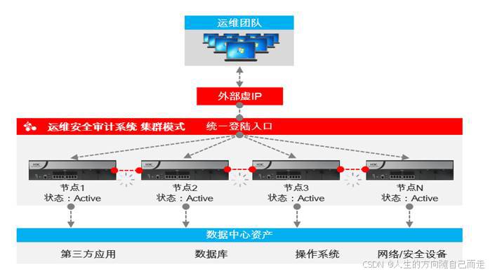 支持三台或以上的运维审计系统组建集群部署模式,通过VIP对外提供服务,集群之间定期自动同步配置数据、审计日志。当集群中任何一台设备出现故障时,由其他节点自动接管服务,以满足高并发、高冗余的应用需求。系统不依赖第三方负载均衡或存储设备及可完成自身集群的搭建。