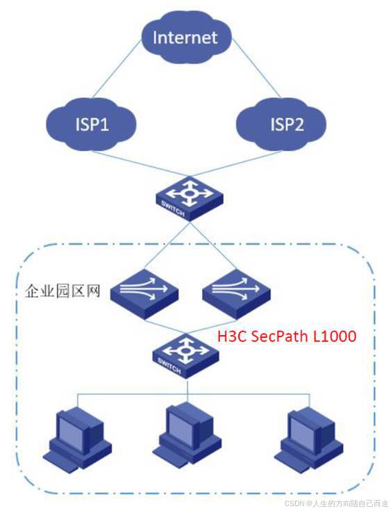 如果企业园区网从两个运营商分别租用了两条物理链路(ISP1和ISP2),为了实现对内网用户访问外部网络的快速响应,选择最优的链路,可以在网络出口处部署H3C SecPath L1000应用交付安全网关产品,采用就近性算法或带宽算法选择到达目的地址的最优链路。具体组网如图所示。