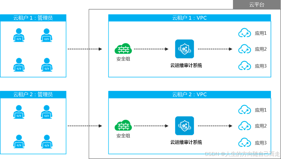 H3C SecPath A2000-Cloud系列 云运维审计系统部署租户VPC内,通过安全组策略保证成为运维的唯一入口,租户管理员可通过云网络访问至云运维审计系统,从而对管理员进行身份认证,运维操作的权限管控,并实现操作行为的审计回溯。