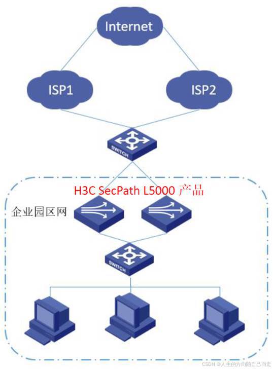 如果企业网从两个运营商分别租用了两条物理链路(ISP1和ISP2),为了实现对外服务快速响应,以及对内网用户访问外部网络的快速响应,选择最优的链路,可以在网络出口处部署H3C SecPath L5000应用交付安全网关产品,采用就近性算法或带宽算法选择到达目的地址的最优链路。具体组网如图所示。