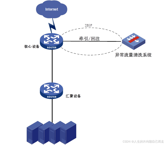 旁路引流场景下,流量通过动态路由转发至异常流量清洗系统,一旦设备故障动态路由便会自动收敛,业务流量又重新回到原转发链路,因此不会因为异常流量清洗设备的增加而增加更多的网络故障点。