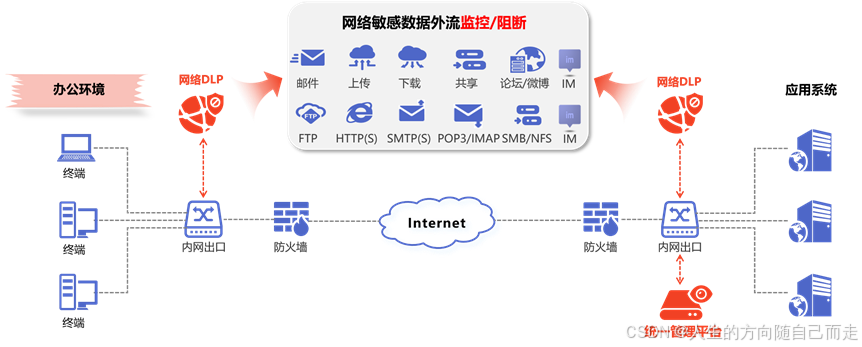 适用于网络出口流量中的敏感内容检测与监控,并提供对触发安全策略的数据泄露事件进行阻断,系统支持 HTTP/HTTPS/FTP/SMTP等协议。阻断部署方式包含:代理模式(正向、反向)、路由模式、网桥模式以及ICAP。