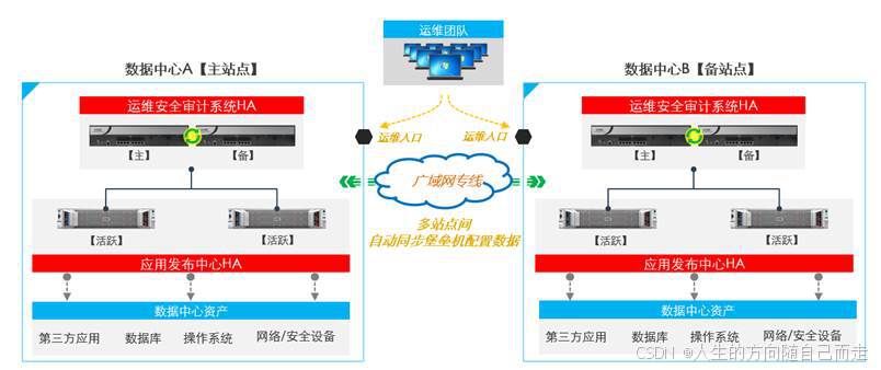 支持三台或以上的运维审计系统组建多站点部署模式,主站点的配置数据定期自动同步至备站点,当主站点的运维审计出现故障时,由其他站点的运维审计按顺序自动接管服务,以满足多个数据中心高冗余的应用需求,实现异地运维管理。