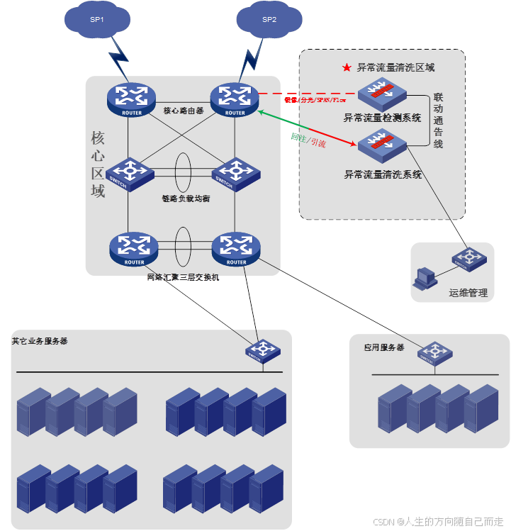 动态引流:无攻击时业务不经过清洗设备,当业务地址存在攻击时,会由检测设备联动清洗系统动态牵引受攻击业务进入清洗设备。降低清洗系统载核;