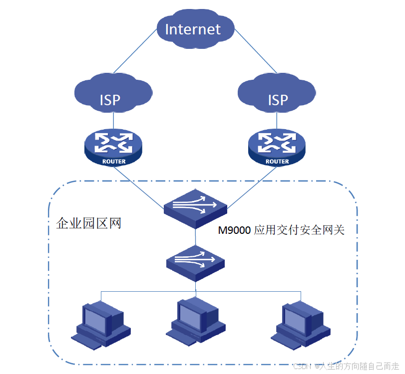 如果企业园区网从两个运营商分别租用了两条物理链路(ISP1和ISP2),为了实现对内网用户访问外部网络的快速响应,选择最优的链路,可以在网络出口处的部署H3C SecPath M9000应用交付安全网关,采用就近性算法或带宽算法选择到达目的地址的最优链路。具体组网如图所示。