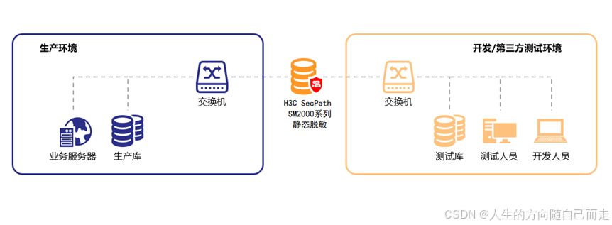 H3C SecPath DM2000-S系列静态脱敏可布署在生产环境和开发/第三方测试环境中间,保证前后路由可达即可。生产库中的原始数据,经过H3C SecPath DM2000-S系列静态脱敏后离线分发至测试环境,整个过程数据保持不落地。如果因为网络隔离原因,不能同时连接双方数据库,则可通用文件中转的方式进行脱敏任务作业。