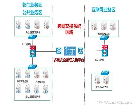 根据《GW0013-2017政务云安全要求》,互联网业务区与部门业务区、互联网业务区与公共业务区之间需通过"跨网交换系统"进行数据交换,多级安全互联交互平台可以部署在跨网交换系统区域,集中管理中心可部署于政务云的内部管理区域。