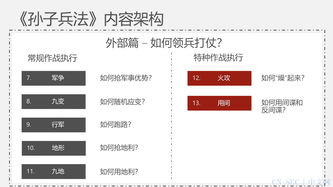 ► 外部方面的两组主要讲的是具体军队出动时,在外面如何领兵打仗,是执行操作层面的具体内容。第三组常规作战执行的五篇主要讲的是军队在外面行军打仗时遇到的各种问题处理,例如兵力分配、协同作战、天时、地利、阴阳气候、行军、地形等等,第四组特种作战执行的两篇讲的是两个特种作战执行操作,火攻和用间谍。