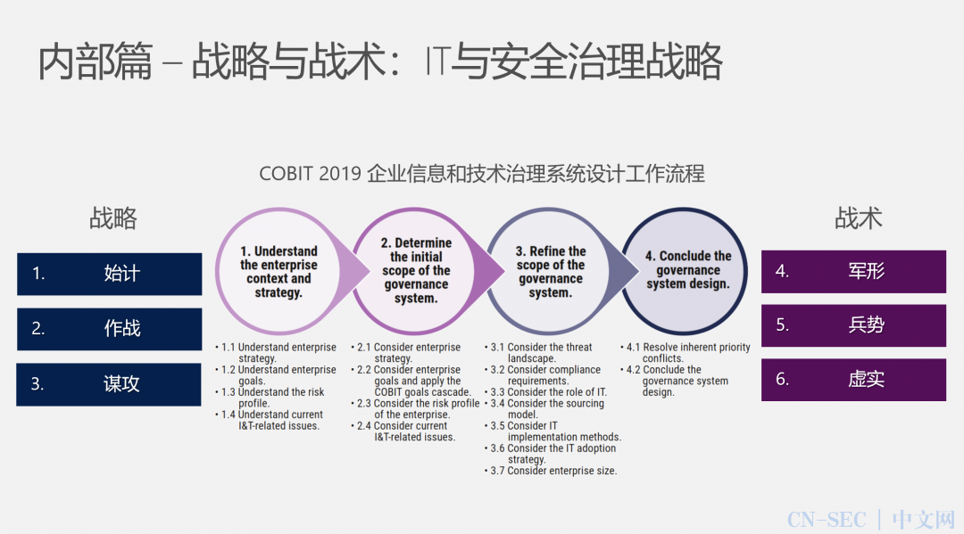 上图是COBIT 2019,企业信息和技术治理系统的设计工作流程。它围绕企业IT治理,里面涉及到网络安全的部分其实并不多(只有风险管理、安全管理、连续性管理和安全服务管理四个控制对象),它也不是技术框架。但它和孙子兵法的战略和战术部分非常契合。