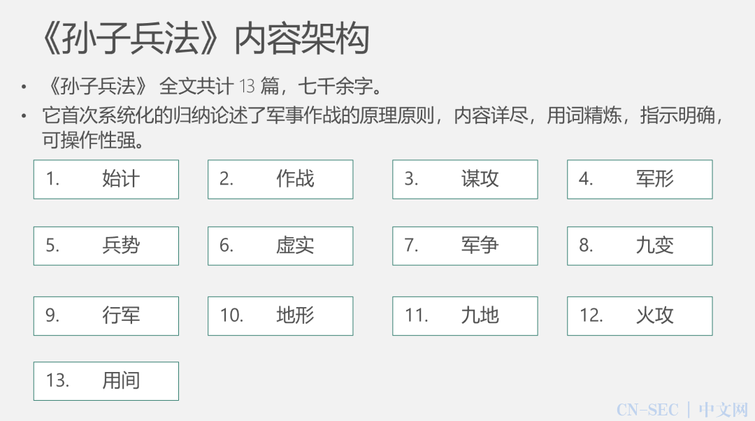 先看一下《孙子兵法》的内容架构。《孙子兵法》 全文共计十三篇,七千余字,它首次系统化的归纳论述了军事作战的原理原则,内容详尽,用词精炼,而且指示明确,可操作性强。