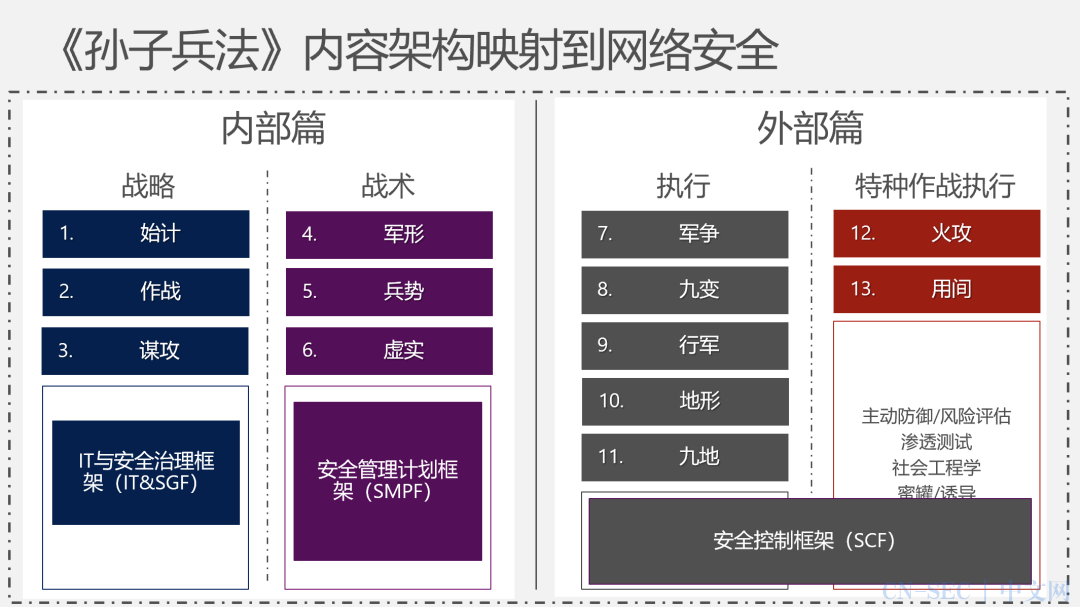 首先在内部篇 的战略 层面,这就等同于我们网络安全的企业IT治理目标,网络安全战略规划、治理框架之类;内部篇的战术层面,等同于我们的战术、策略应用,例如风险评估、组织、策略、制度、流程、技术之类。