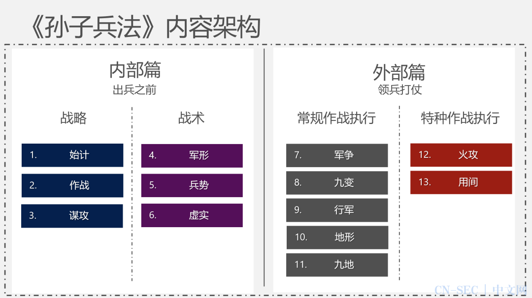 按照不同行动阶段,可把《孙子》十三篇分成内部、外部两个大篇章。内部篇讲的是出兵之前的谋划与准备,而外部篇讲的是在外领兵打仗。内部篇又可以分为两组:战略和战术,外部篇也可以分为两组:常规作战执行和特种作战执行,共计四组。
