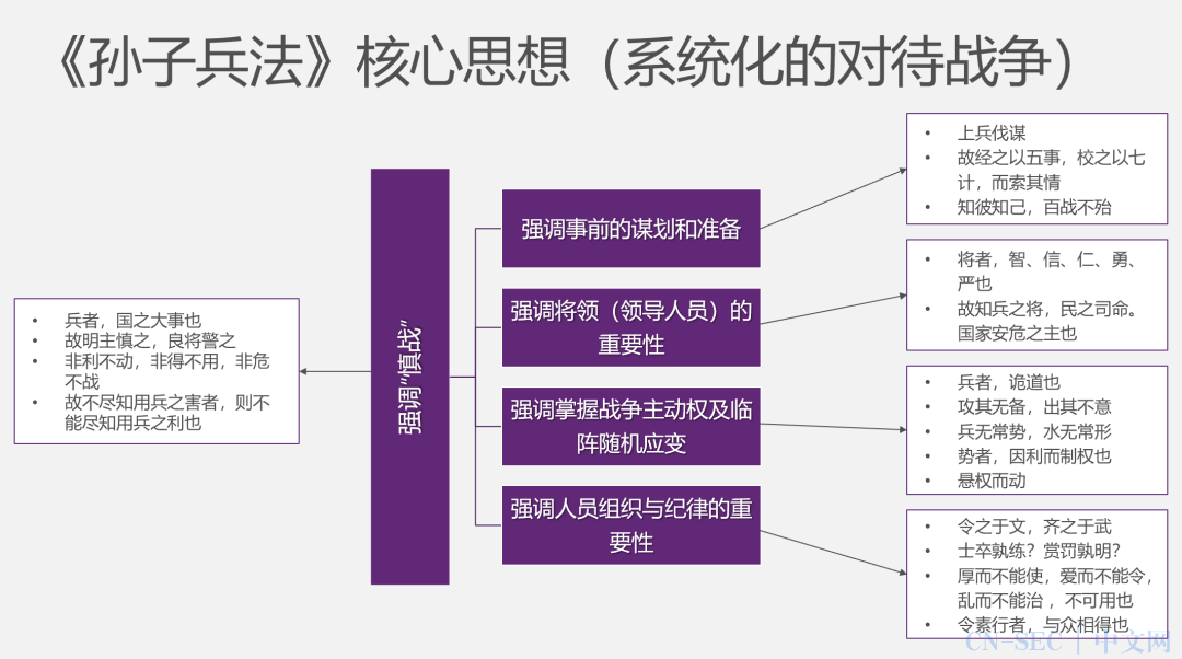 ► 首先第一个就是强调慎战,谨慎的对待战争,开篇第一句就是"兵者,国之大事",说战争是国家至关重要的事情,而且讲了很多战争的不利之处,所以要谨慎对待。