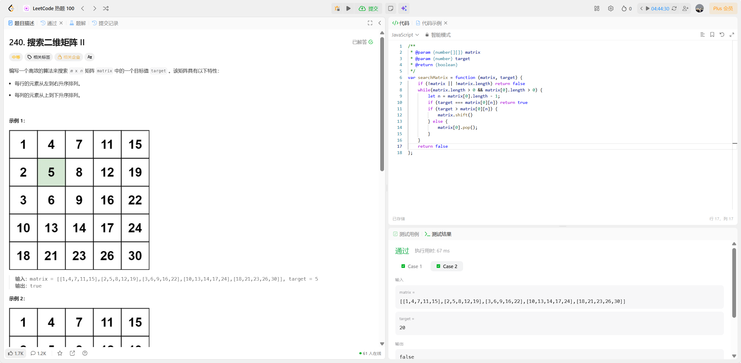 1.判断第一行的最后一个数是否大于目标值,如果小于目标值,说明肯定不在这一行,直接舍弃这一行