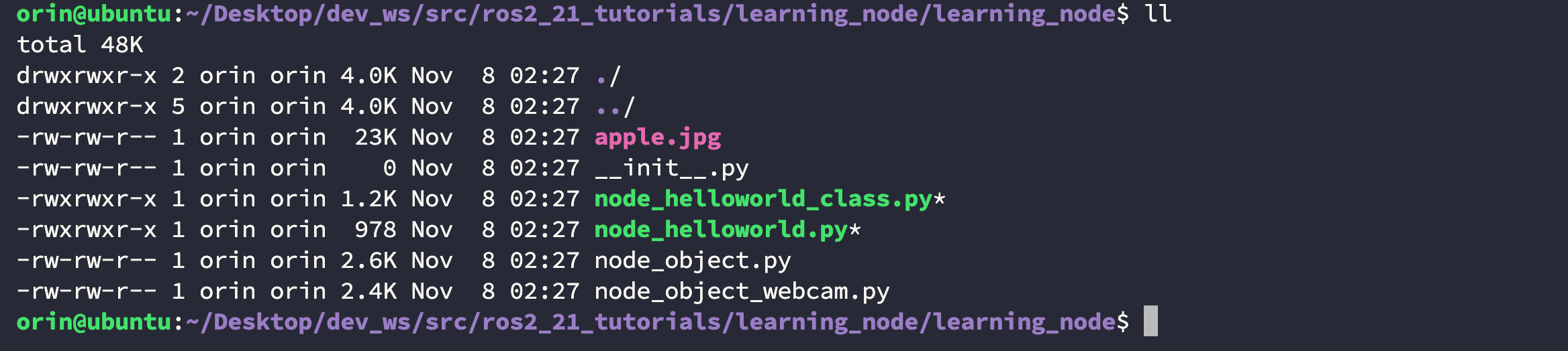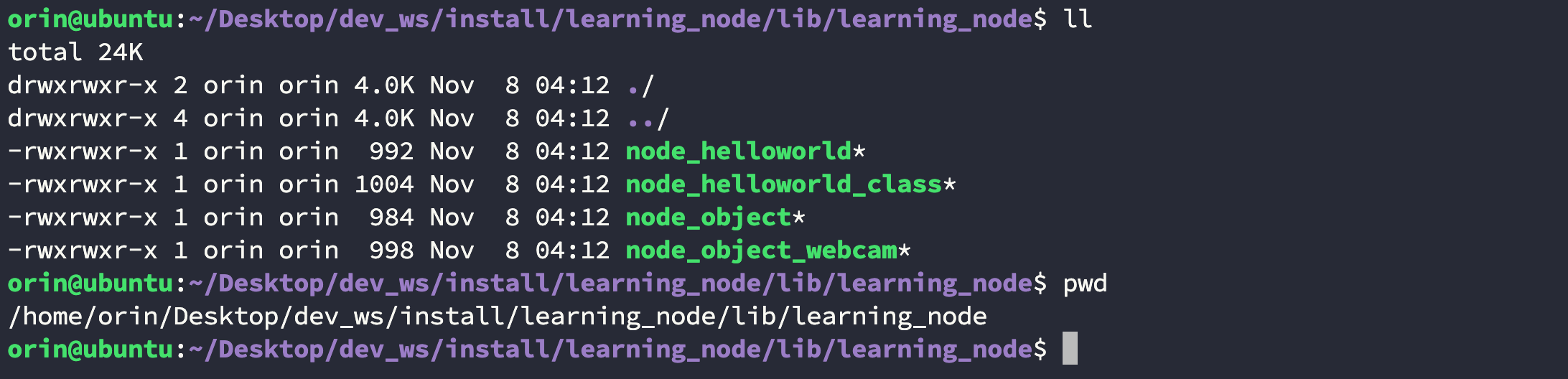 所有编译好的 python 节点会存储在 /home/orin/Desktop/dev_ws/install/learning_node/lib/learning_node 位置处: