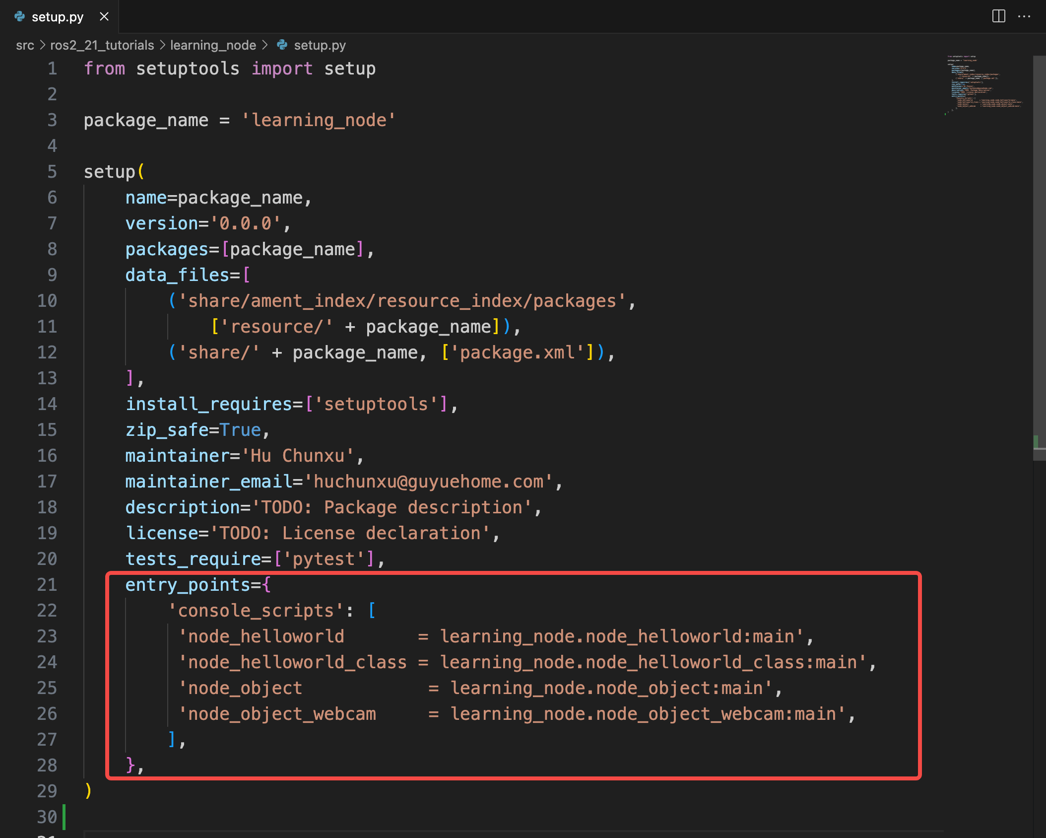 该文件位于 /dev_ws/src/ros2_21_tutorials/learning_node/setup.py 处,关注最下方 entry_points 字段: