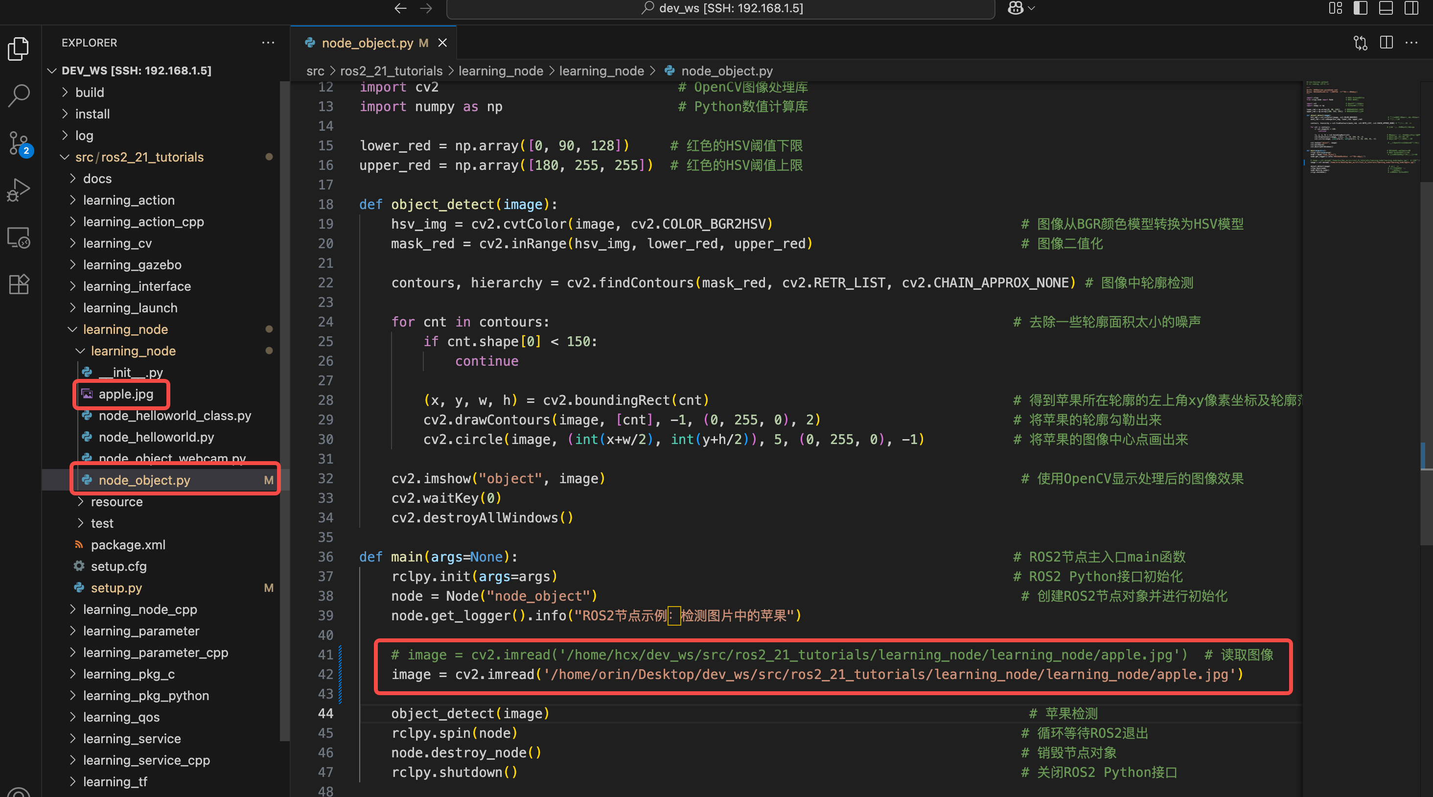 作者在 src/ros2_21_tutorials/learning_node/learning_node/node_object.py 处提供了一个图像识别节点,你需要修改代码第 41 行附近的绝对路径,其原始文件就在当前目录下:
