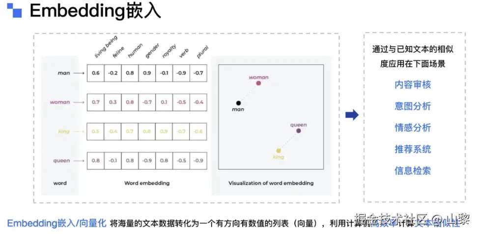 - 在具体实现中,嵌入的每个维度通常对应文本的某种特征,例如性别、类别、数量等。通过多维度的数值表示,计算机能够理解并解析文本的复杂语义结构。例如,"man"和"woman"在描述性别维度上具有相似性,而"king"和"queen"则在性别和王室身份等维度上表现出相似的语义特征。