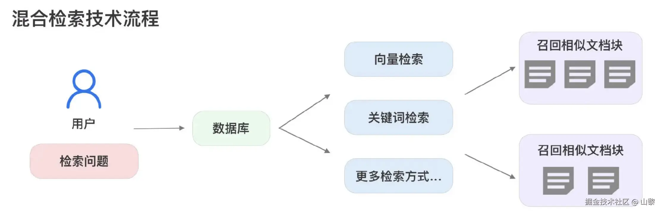 混合检索是指在检索过程中同时采用多种检索方式,并将各类检索结果进行融合,从而得到最终的检索结果。混合检索的优势在于能够充分利用不同检索方式的优点,弥补各自的不足,从而提升检索的准确性和效率。下图展示了混合检索的流程: