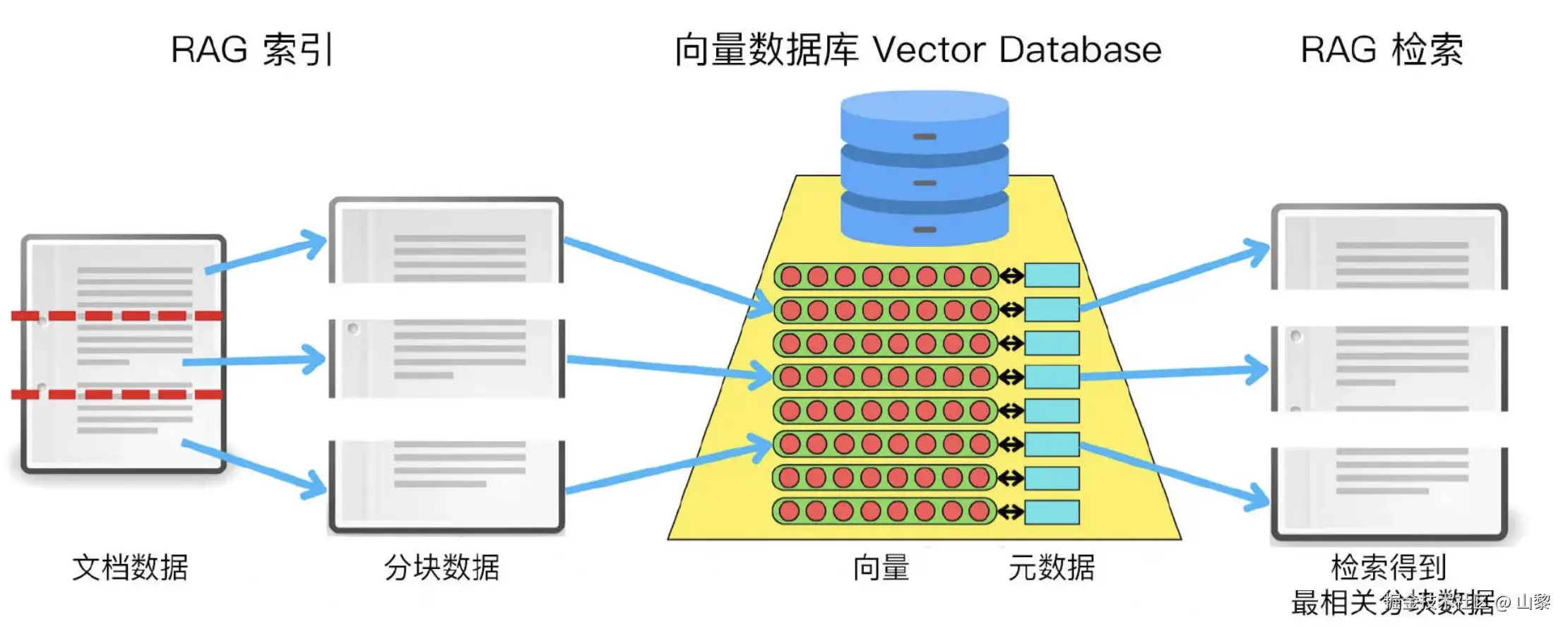 例如,当你需要精准搜索某个订单 ID、品牌名称或地址,或者搜索特定人物或物品的名字(如周杰伦、 小米14)时,向量检索的准确性往往不如关键词检索 。此外,当用户输入的问题非常简短 ,仅包含几个单词时,比如搜索缩写词或短语(如 RAG、LLM),语义匹配的效果也可能不尽理想。