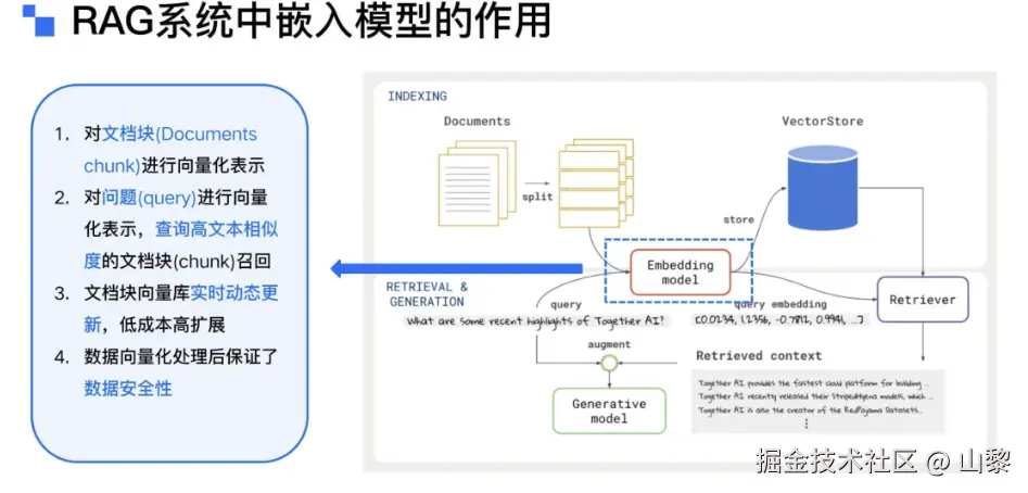 - 在 RAG 系统中,Embedding Model 嵌入模型扮演着关键角色,负责将文本数据映射到高维向量空间,以便高效检索和处理。具体而言,Embedding Model 将输入的文档片段(Chunks)和查询文本(Query)转换为嵌入向量(Vectors),这些向量捕捉了文本的语义信息,并可在向量空间中与其他嵌入向量进行比较。