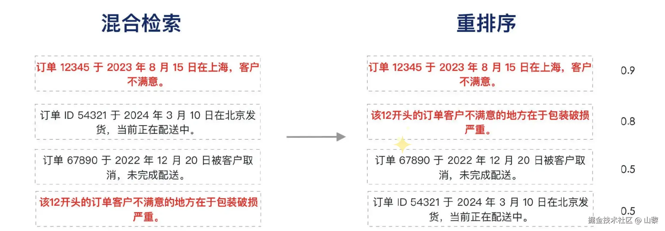 在这个案例中,我们通过重排序技术成功找到了与问题语义最契合的结果。系统评分显示,"订单 12345 于 2023 年 8 月 15 日在上海,客户不满意。"与"该 12 开头的订单客户不满意的地方在于包装破损严重。"这两个文档块的相关性分别为 0.9 和 0.8,排序为第一和第二位。