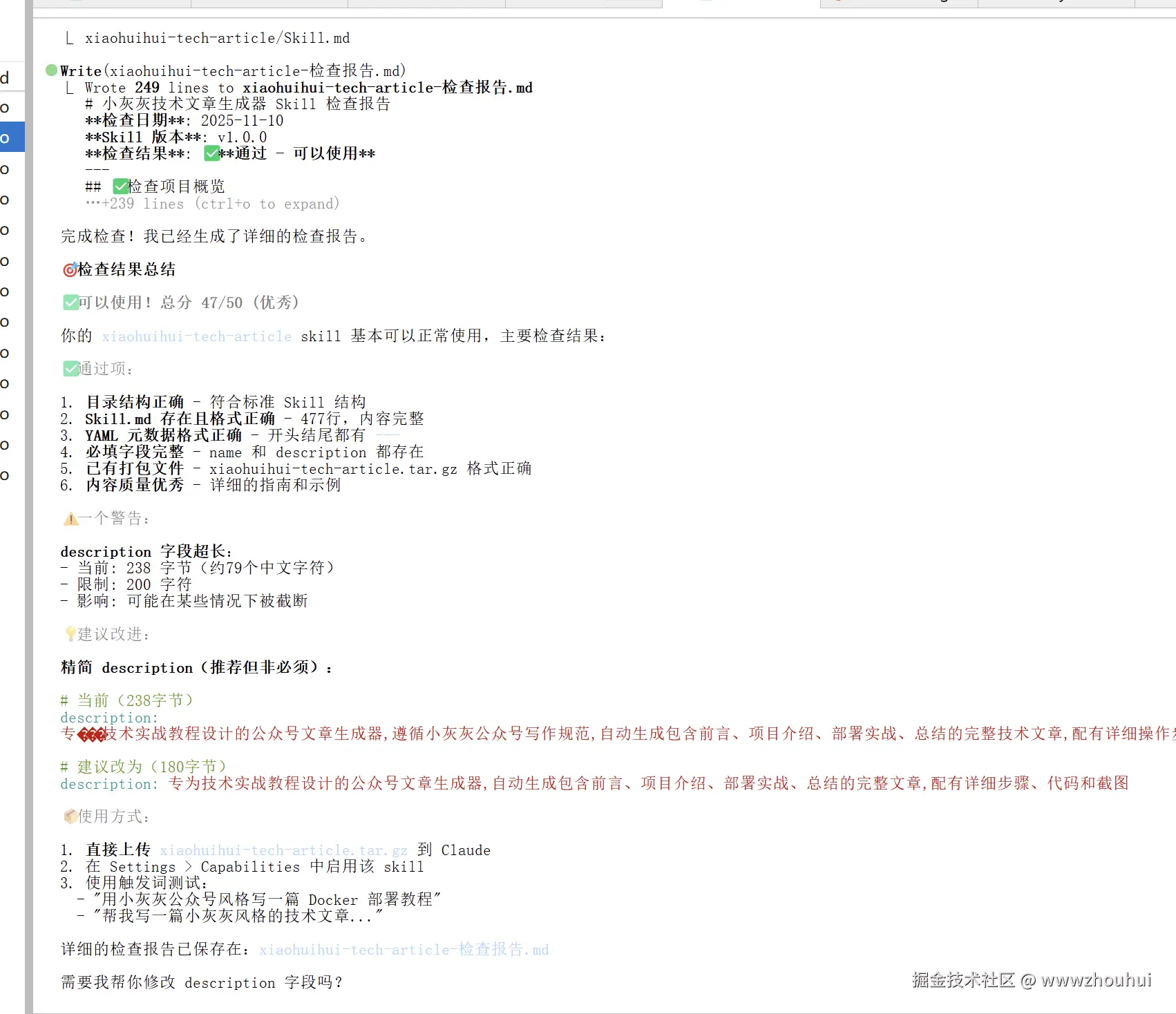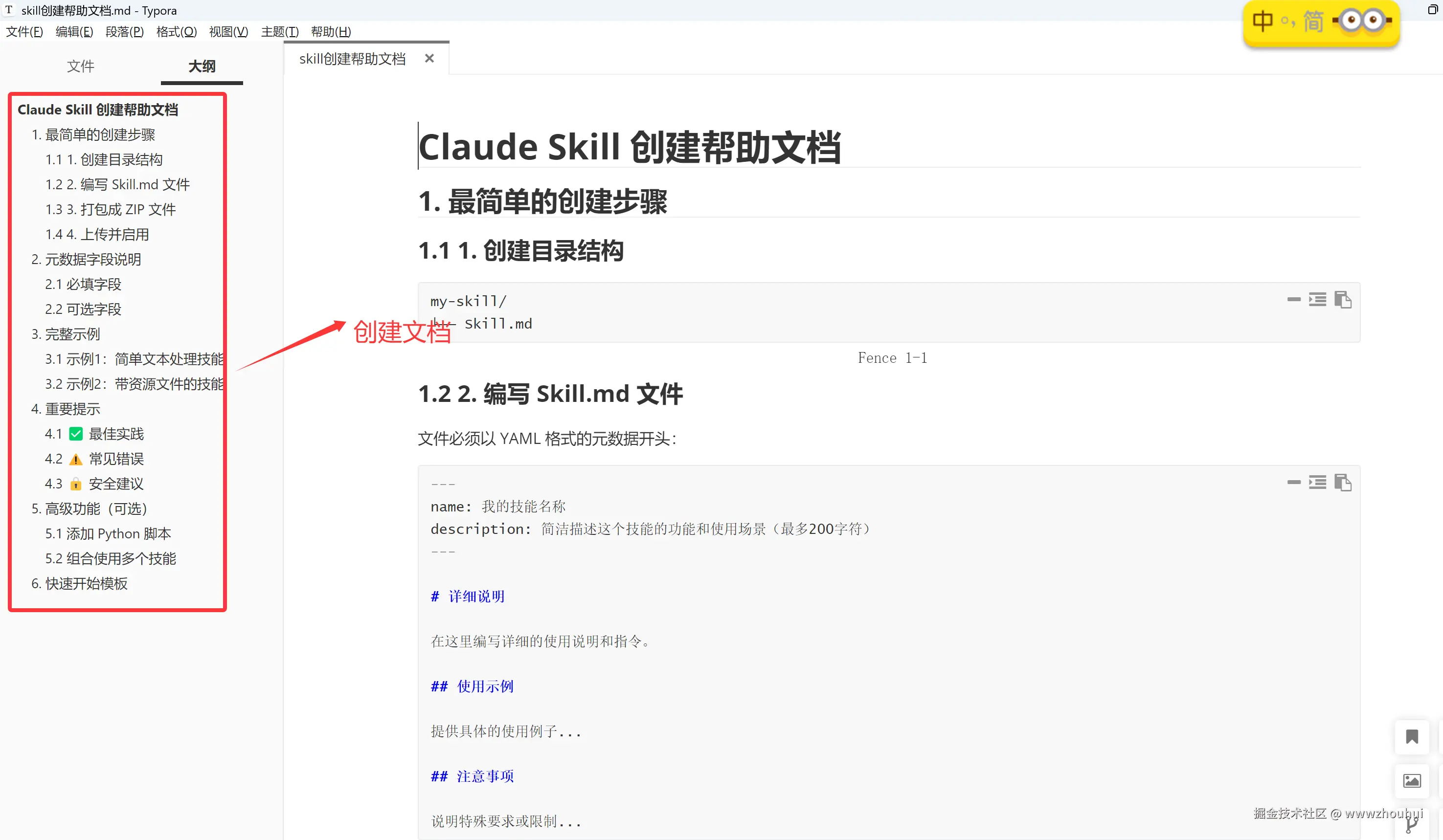 AI 很快帮我生成如何创建这个skill,这样我们看到中文就好很理解了。 打开文档看一下。(我们使用markdown工具打开)