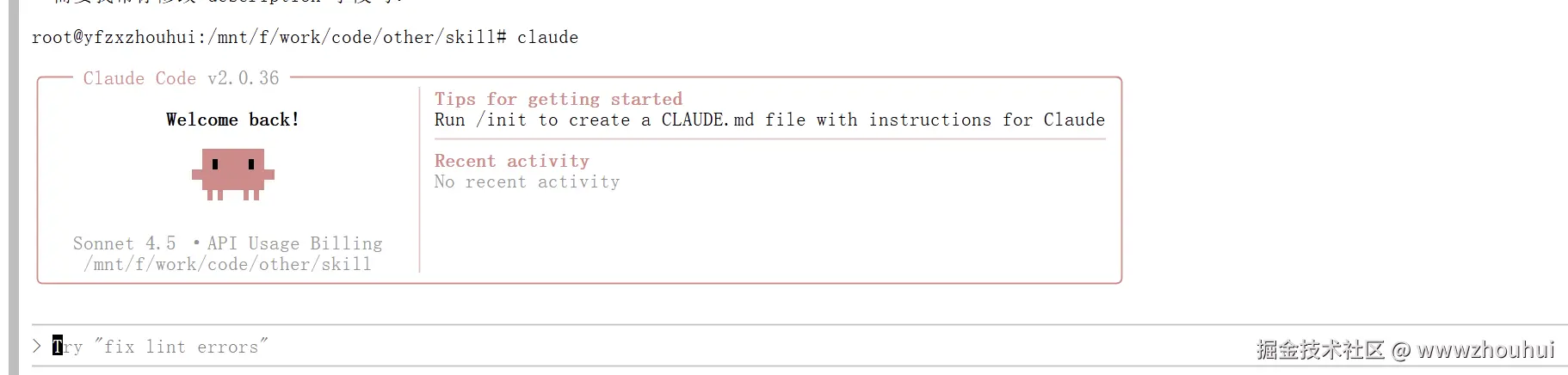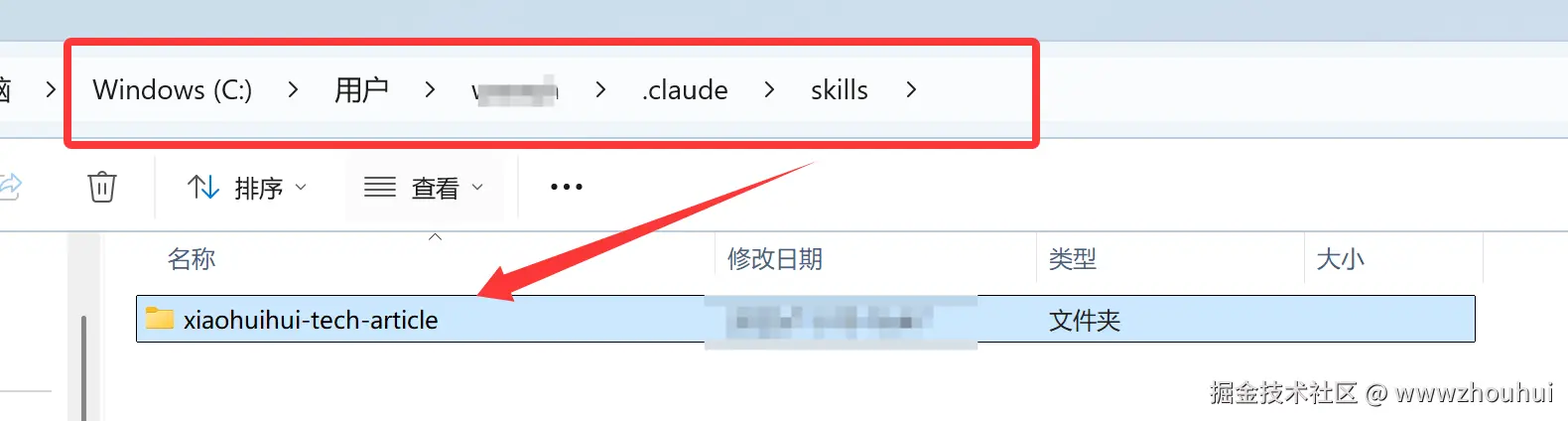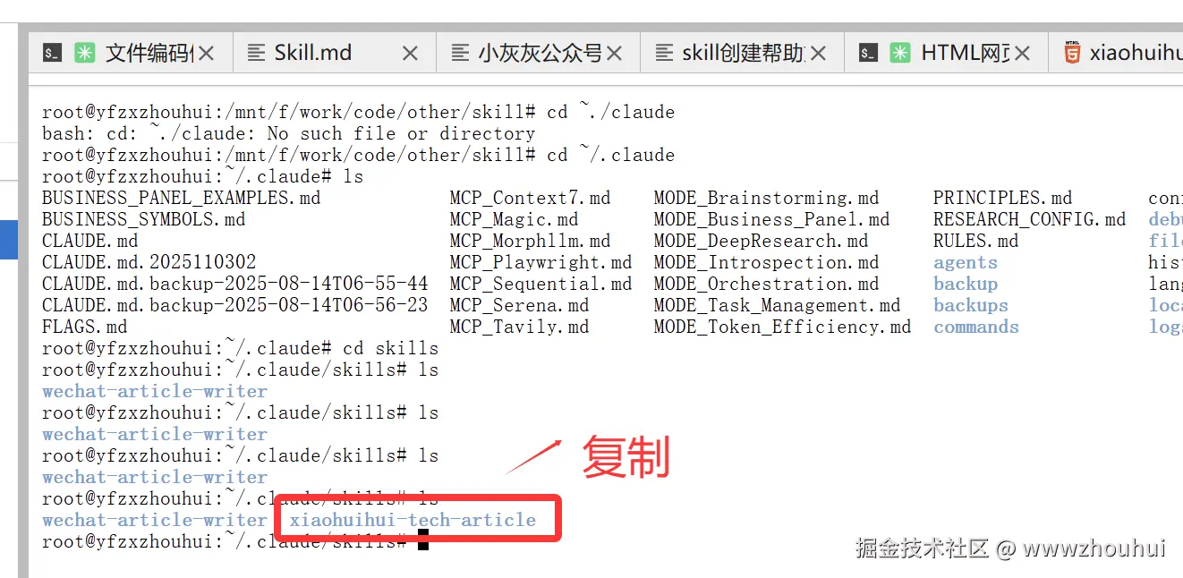 接下来我们需要安装这个自己开发的skill。我们这个这个压缩包复制到~/.claude/skills 文件夹中