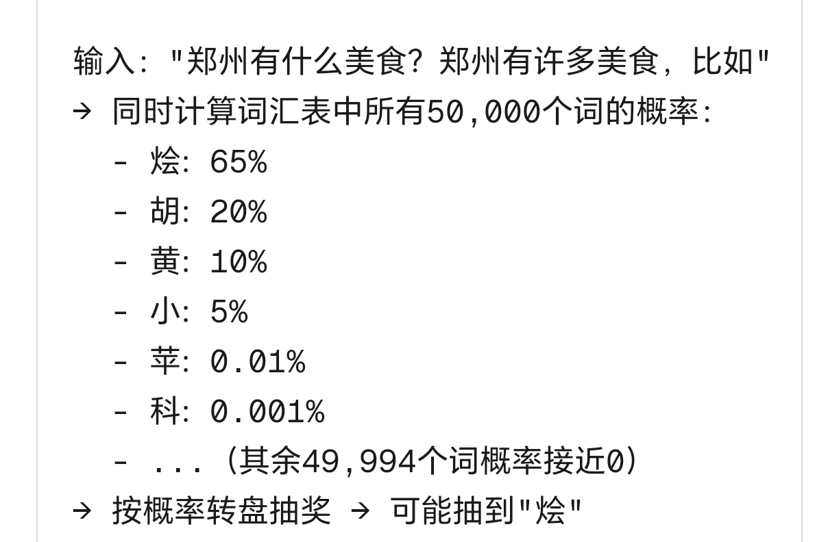 就如同上面这个图片所展示的,接受到问题后会计算词汇表中的词"拼接"到问题后面的概率(分数),并按照概率(分数)进行抽取,并不是一定会抽到概率(分数)最大的,是随机抽取只不过概率(分数)大的,抽到的几率大。