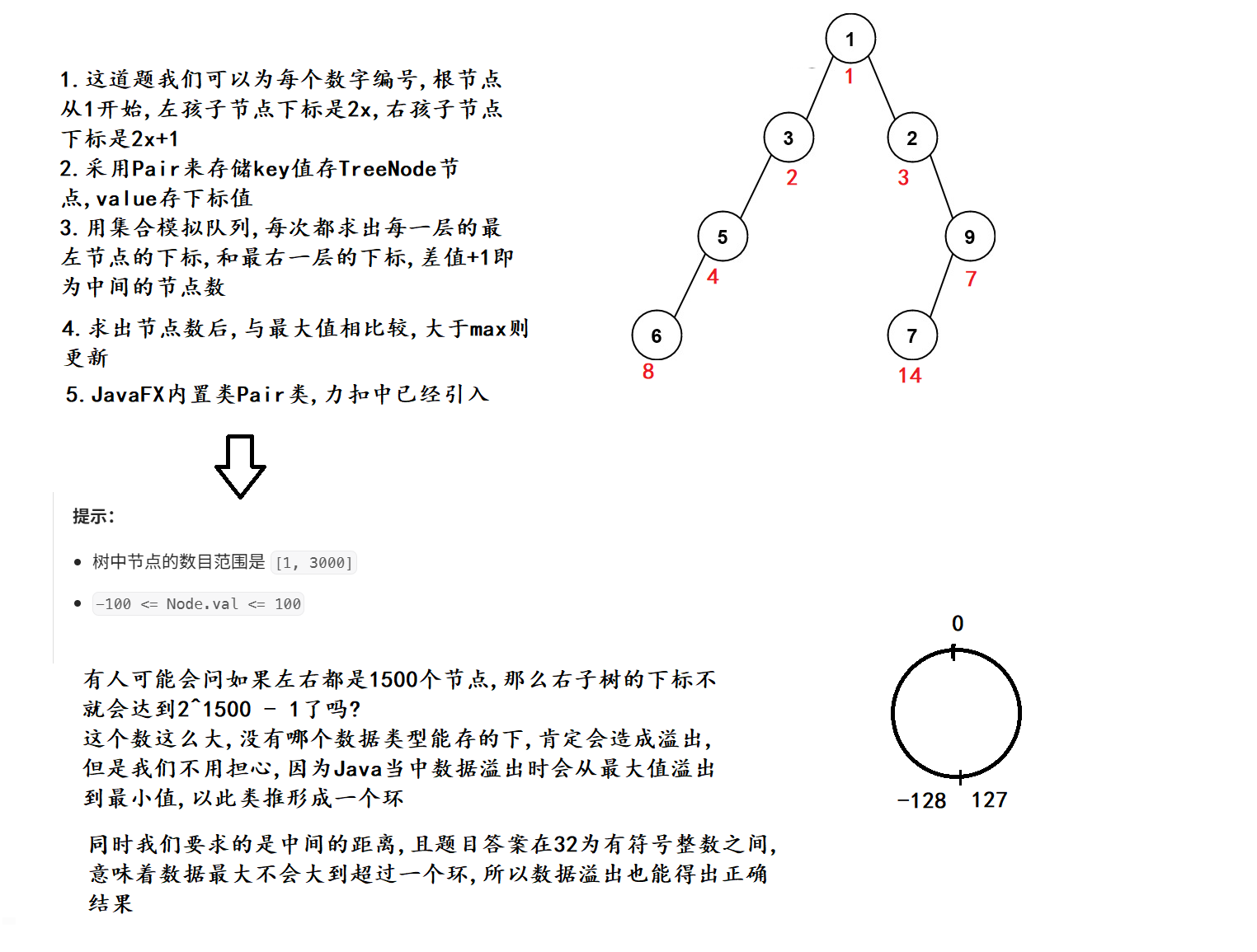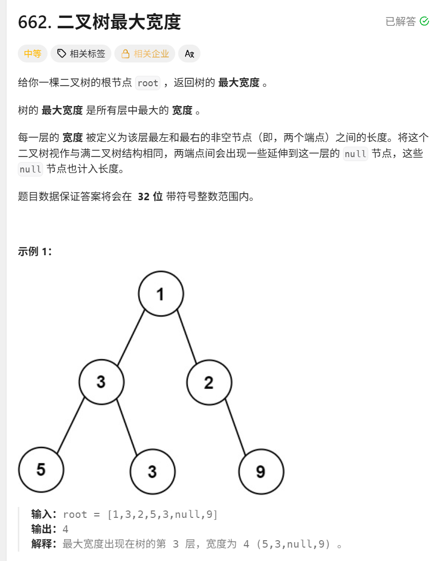 题目意思是让求整颗二叉树中最大的宽度,需要注意的是:宽度是指最左和最右节点中间的距离,中间的空节点也计算在内