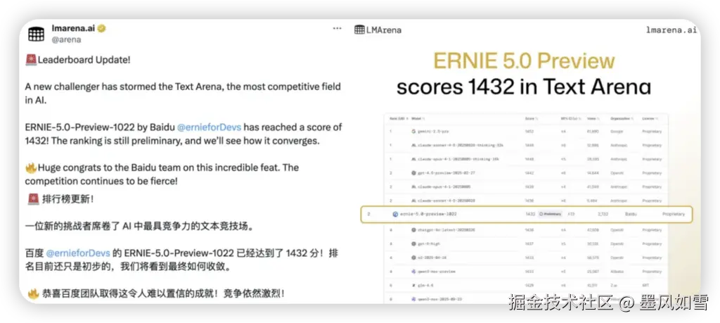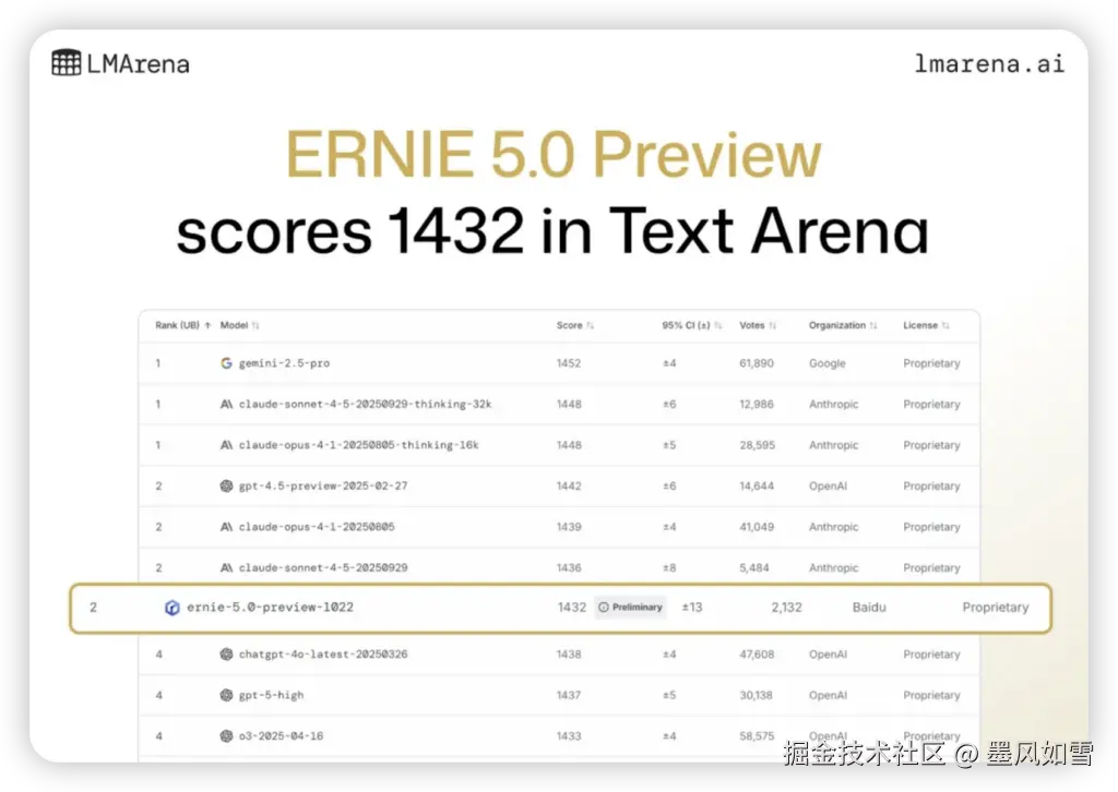 就在最近的LMArena Text Arena榜单上,文心5.0 Preview(ERNIE-5.0-Preview-1022)凭借1432分的Elo高分,与OpenAI的GPT-4.5-Preview、Anthropic的Claude-Opus-4-1等国际顶级模型平起平坐,一同位列全球并列第二。更令人兴奋的是,它超越了包括GPT-5-High、Qwen3-Max、DeepSeek-R1在内的诸多国内外主流强劲对手。这不光是文心的胜利,更是国产大模型迈向全球巅峰的重要里程碑。