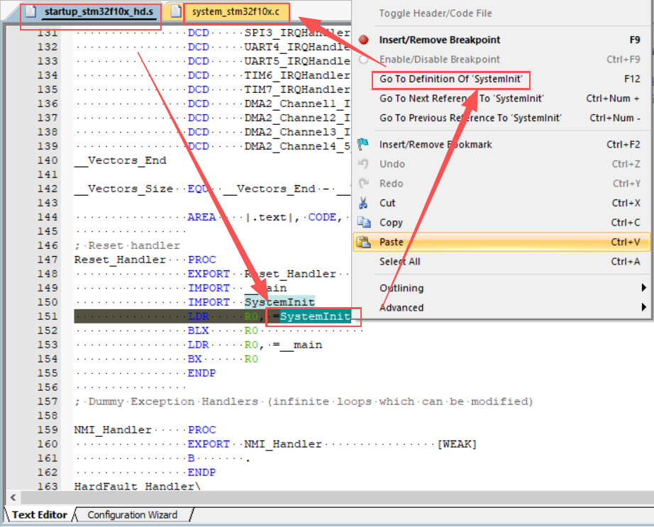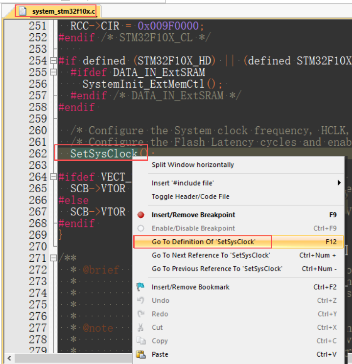 system_stm32f10x.c文件的SystemInit函数中(约第262行),有SetSysClock()函数调用。通过右键菜单的"Go To Definition Of 'SetSysClock'"选项,可以跳转到其定义。