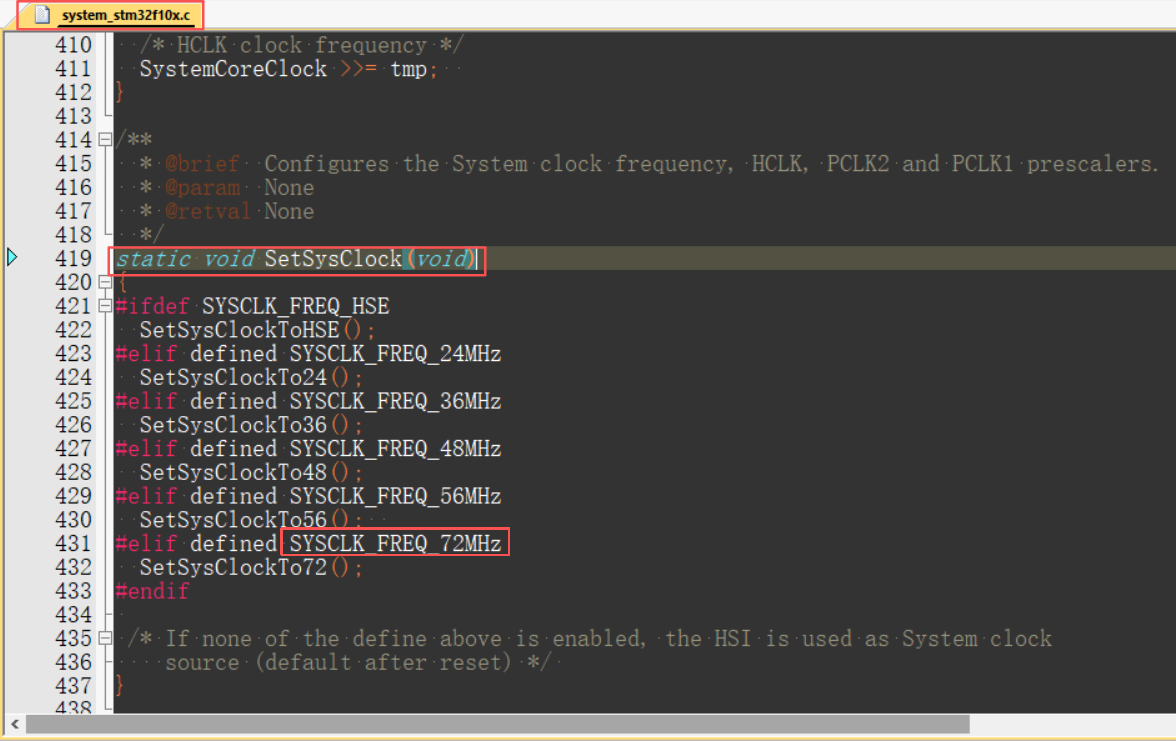 SetSysClock函数的定义(约第419-437行)。它是一个静态函数,内部通过条件编译(如#ifdef SYSCLK_FREQ_72MHz)根据宏定义调用不同的时钟设置函数。