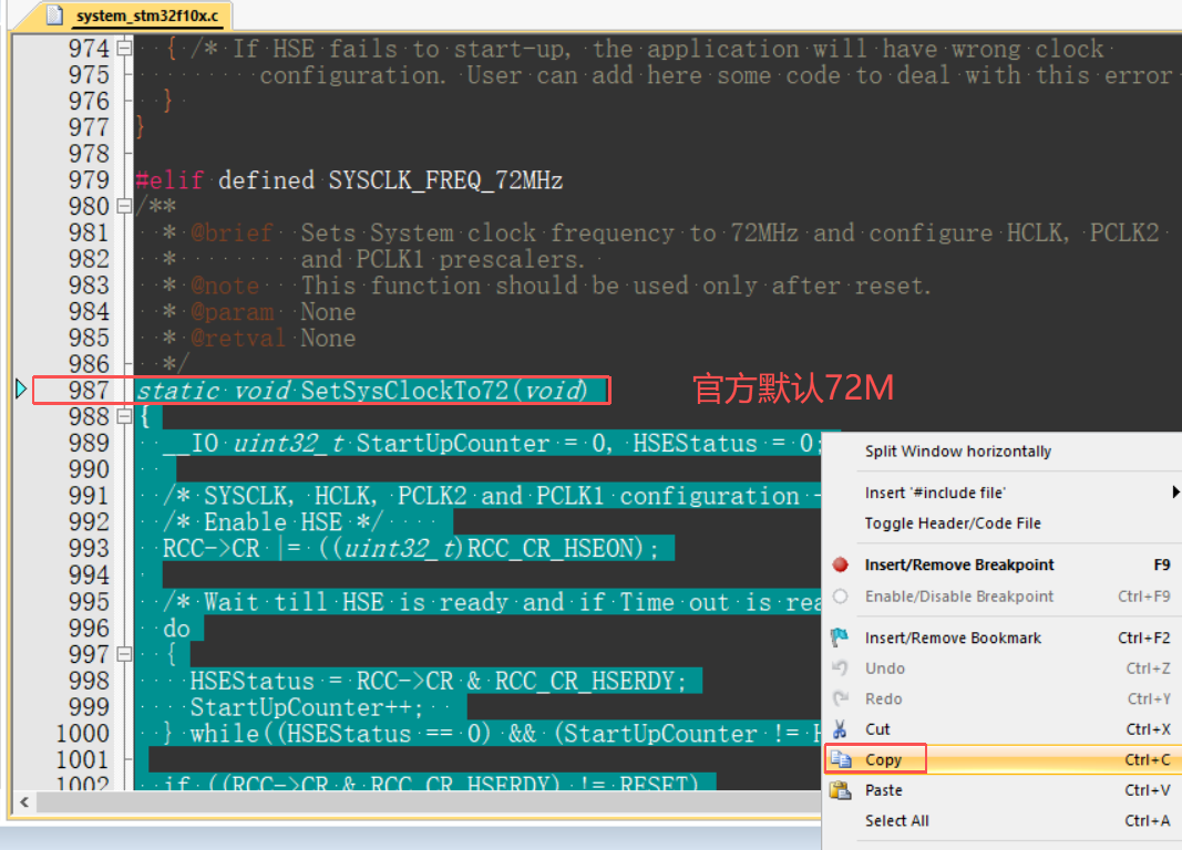从图片可以看出,SetSysClockTo72()函数位于代码文件 system_stm32f10x.c中。具体行号大约在第987行(图片中显示行号范围为974-1002,第987行被红色方框标注,并有"官方默认72M"的提示)。这是该函数的定义位置。
