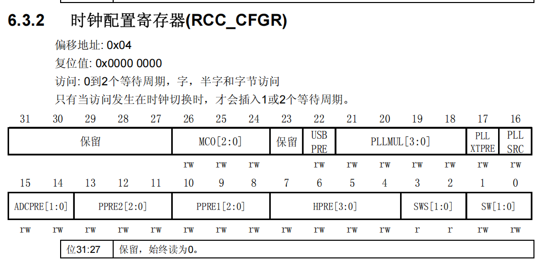 通过配置RCC_CFGR寄存器的不同位段,设置各总线时钟: