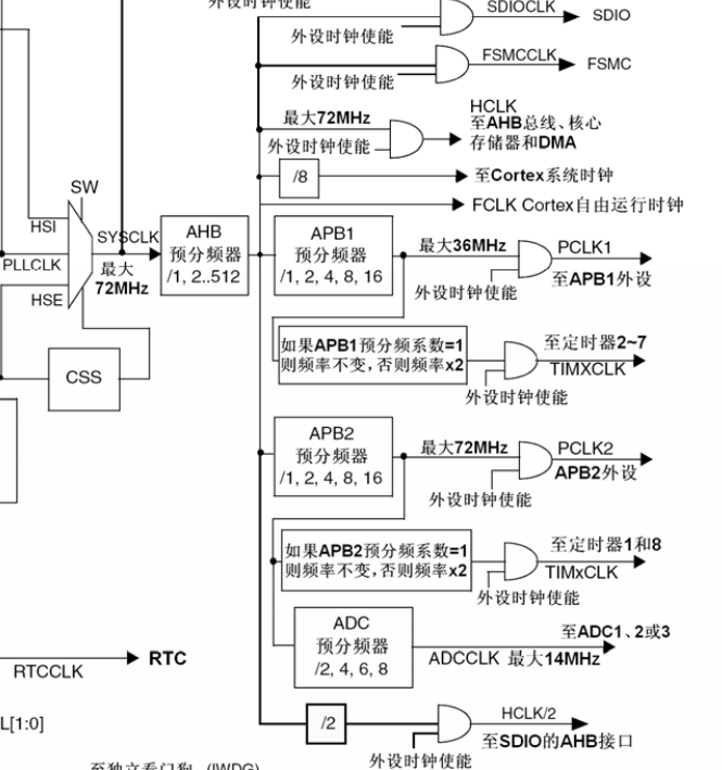 AHB总线连接内核和高速外设,1分频让HCLK跑在72MHz,发挥最大性能。