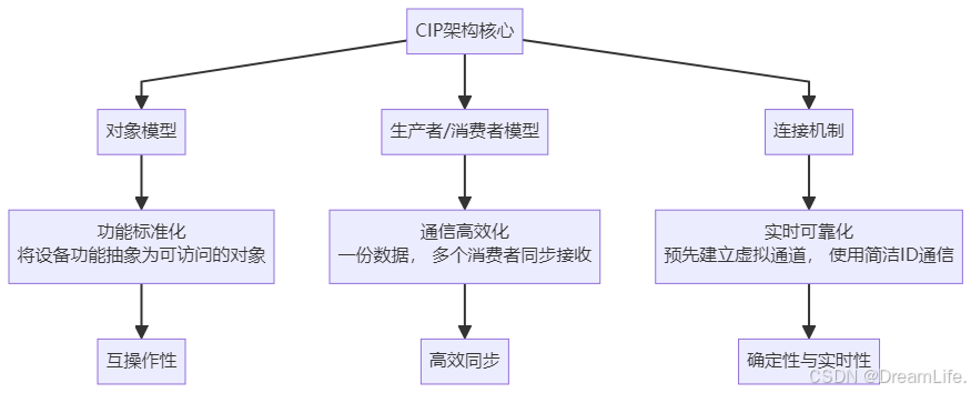 CIP架构的卓越,建立在三大核心设计理念之上,这构成了其高效通信的基石。下面的图表清晰地展示了这三者的关系与分工。