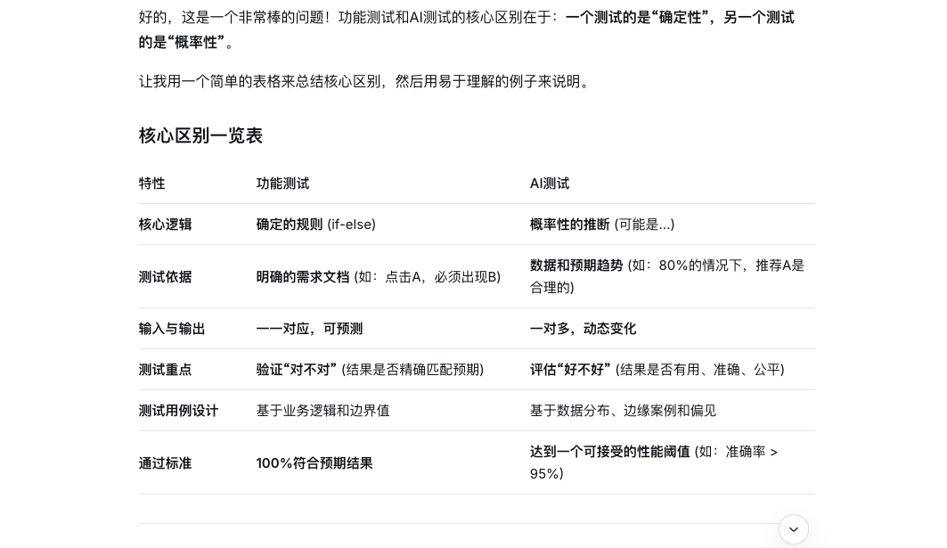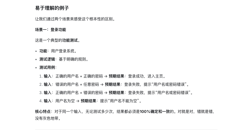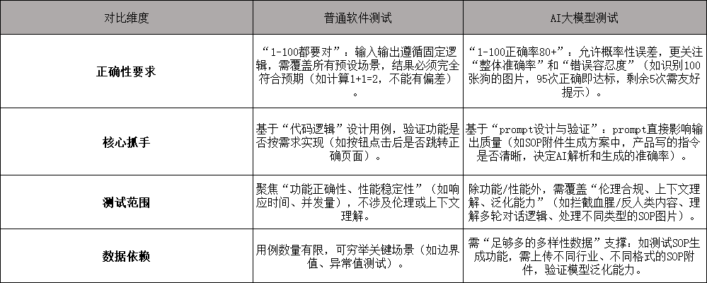 普通测试与AI测试(尤其是大模型测试)的本质差异,源于测试对象的"逻辑特性"不同------普通软件是"代码驱动的确定性系统",AI大模型是"数据驱动的概率性系统",具体差异可通过你提到的场景直观对比: