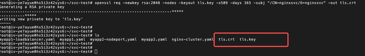 openssl req -newkey rsa:2048 -nodes -keyout tls.key -x509 -days 365 -subj "/CN=nginxsvc/O=nginxsvc" -out tls.crt