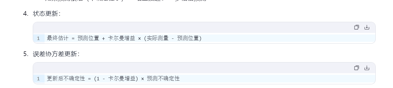 - 更新阶段:当获得新的测量值时,用它来修正预测值