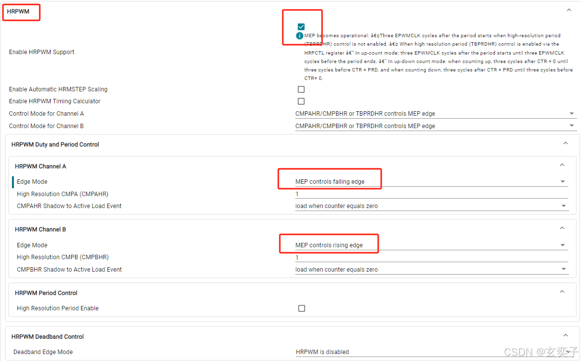 支持高分辨率设置:占空比(CMPAHR/CMPBHR)、周期(TBPRDHR)、相位(TBPHSHR)、死区(DBREDHR/DBFEDHR)。
